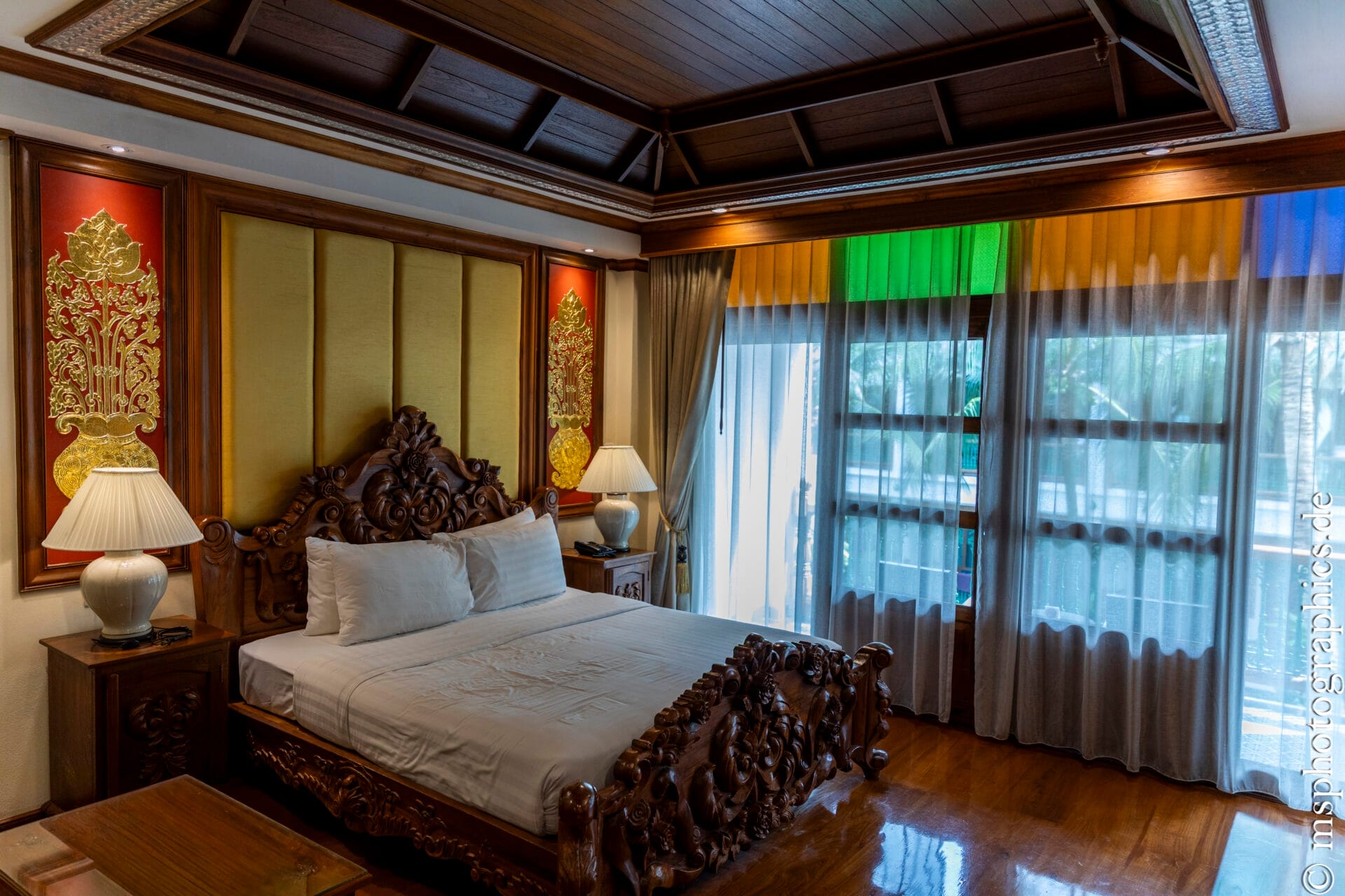 Die Zimmer sind traditionell thailändisch eingerichtet, mit kunstvoll geschnitzten Holzmöbeln. Das vermittelt eine gemütliche und regionale Atmosphäre.