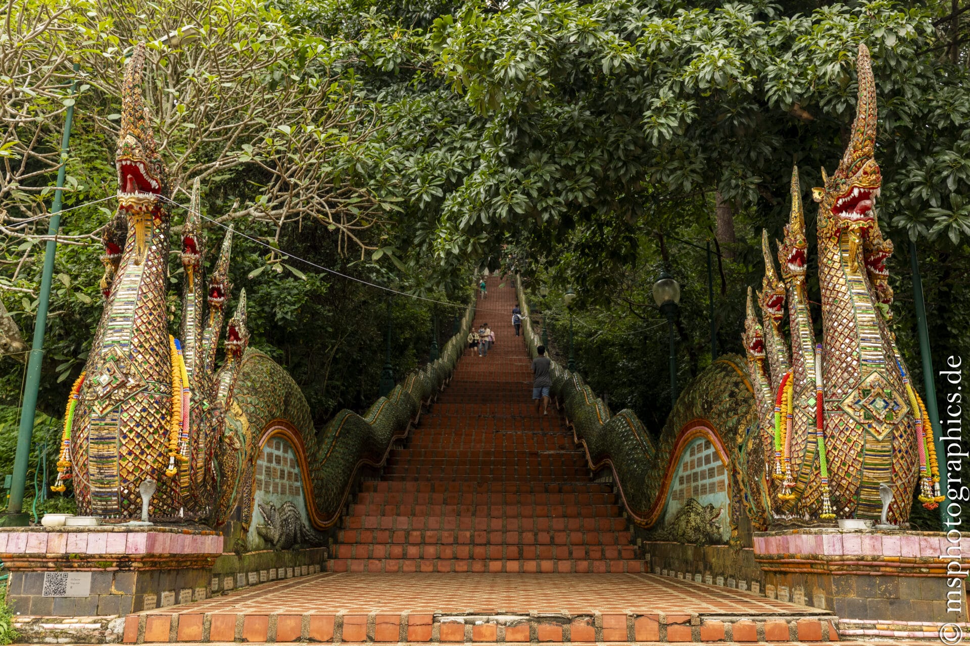Der Zugang erfolgt über eine berühmte Treppe mit rund 306 Stufen, flankiert von kunstvoll gestalteten Naga-Schlangen. Ein wahrhaft ikonischer Anblick und eines der meist fotografierten Motive in Nordthailand.