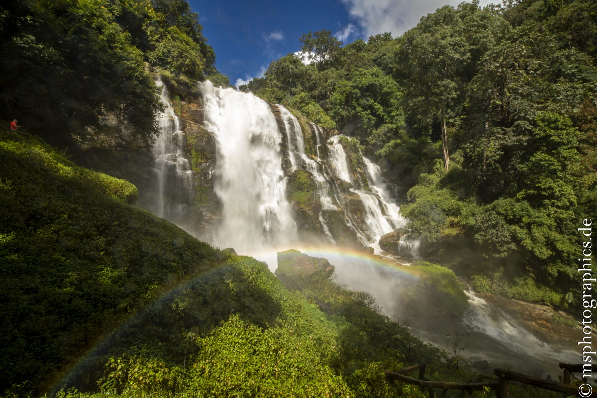 Erster Halt auf unserer Tagestour durch den Doi Inthanon Nationalpark mit Besichtigung des höchsten Bergs in Thailand ist der Wachirathan Wasserfall. Der Wachirathan beeindruckt vor allem durch seine Wassermenge. Das Wasser stürzt in mehreren Stufen über Felsen hinab. Das wirkt in den Monaten der Regenzeit besonders spektakulär.