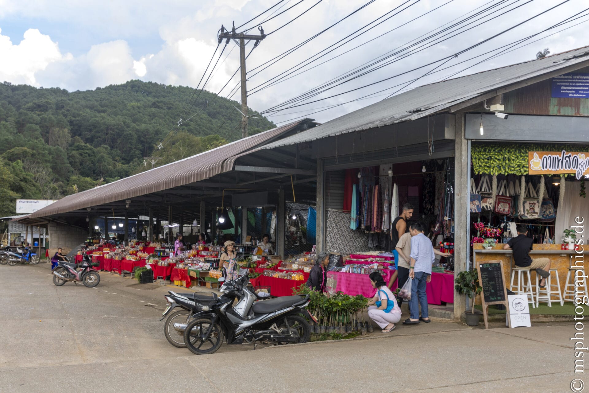 Am Rückweg nach Chiang Mai halten wir noch an einem kleinen Markt an. Dort kann man lokale Köstlichkeiten wie Obst, getrockntete Früchte und weitere Snacks für unterwegs kaufen.