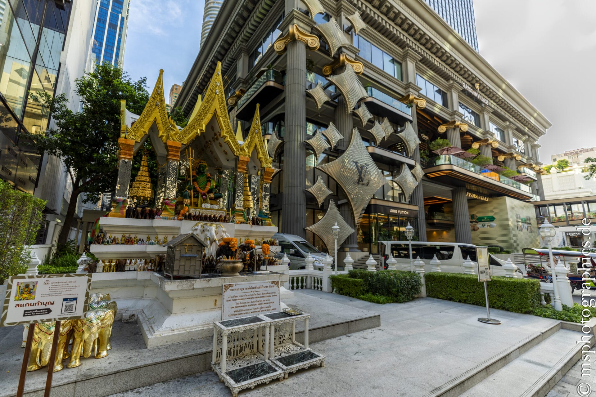 Erawan Shrine, im thailändischen auch San Phra Phrom genannt, gehört zu den bekanntesten und meistbesuchten Schreinen in Bangkok. Er befindet sich mitten im geschäftigen Einkaufsviertel rund um die Ratchaprasong-Kreuzung, ein Ort, an dem moderne Hochhäuser, Einkaufszentren und spirituelle Traditionen auf eindrucksvolle Weise verschmelzen.