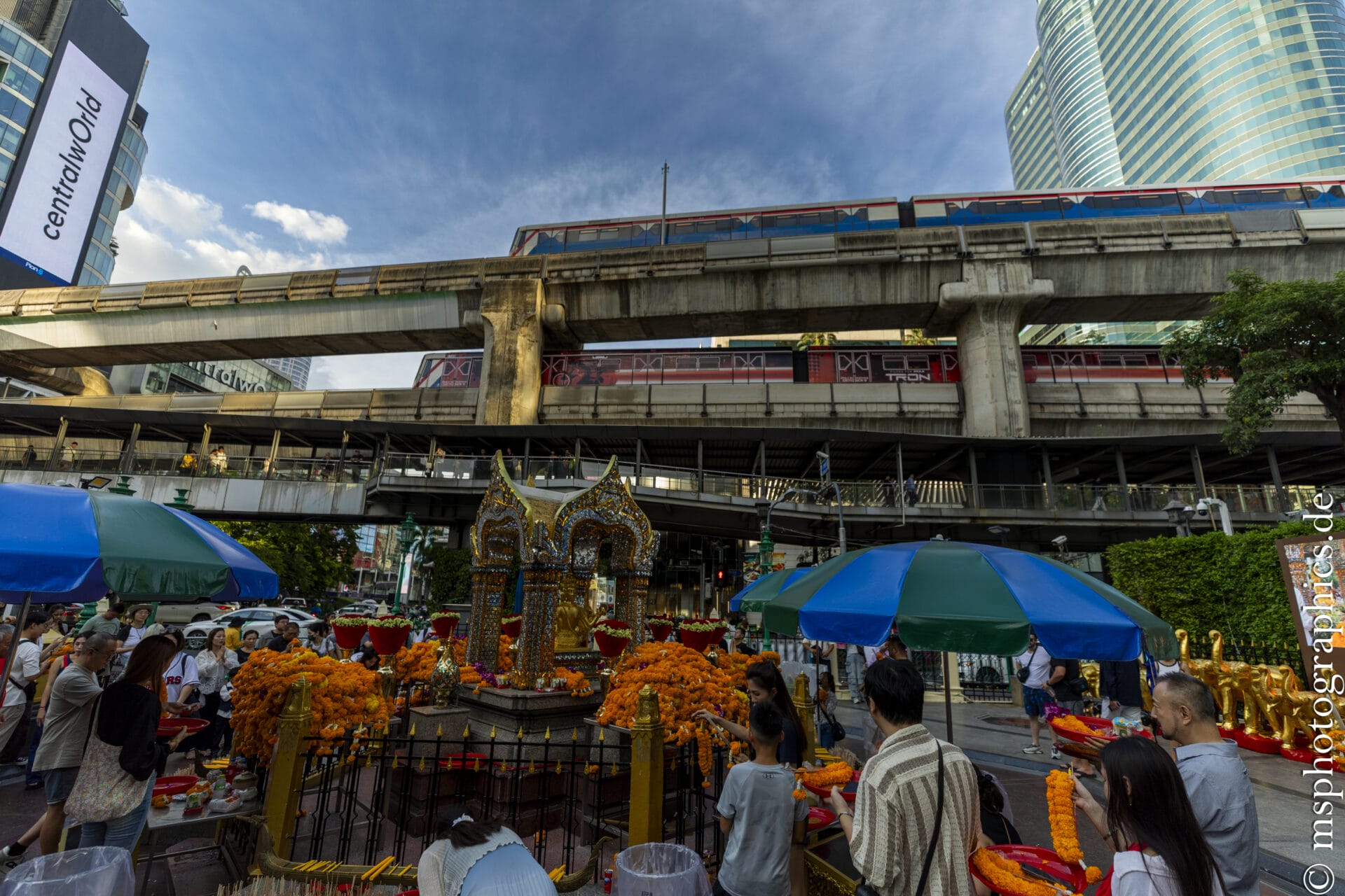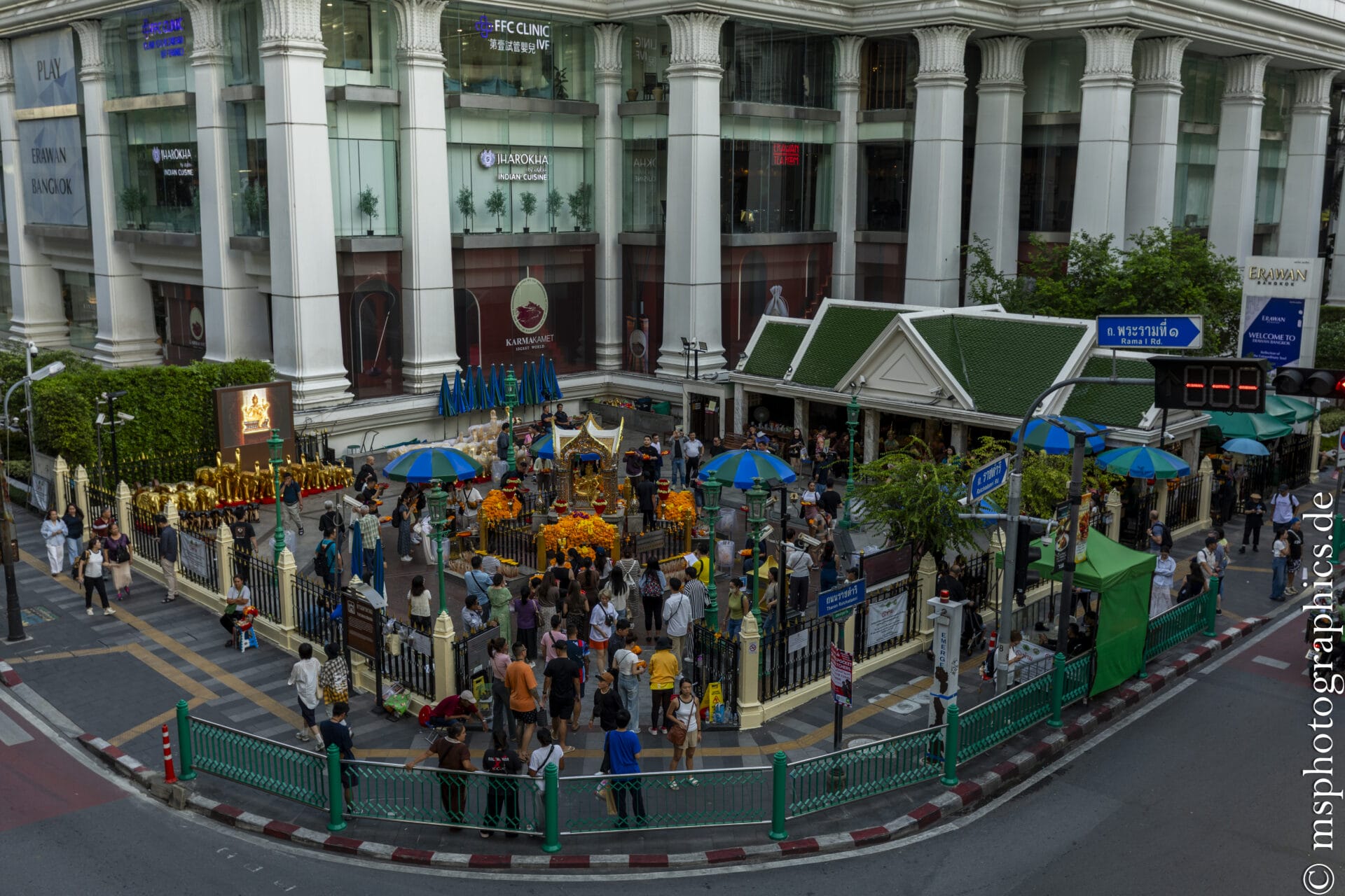Der Schrein ist dem hinduistischen Gott Phra Phrom gewidmet, der in der hinduistischen Mythologie als Brahma bekannt ist. Seine goldene Statue mit vier Gesichtern symbolisiert Weisheit, Mitgefühl, Gerechtigkeit und Güte. Besucher bringen Blumenkränze, Räucherstäbchen oder Opfergaben und bitten um Glück, Schutz, beruflichen Erfolg oder persönliche Wünsche.Besonders eindrucksvoll sind die traditionellen thailändischen Tanzdarbietungen, die von Gläubigen als Dank für erfüllte Bitten organisiert werden. Sie verleihen dem Ort eine einzigartige, fast mystische Atmosphäre, mitten im hektischen Treiben der Großstadt.