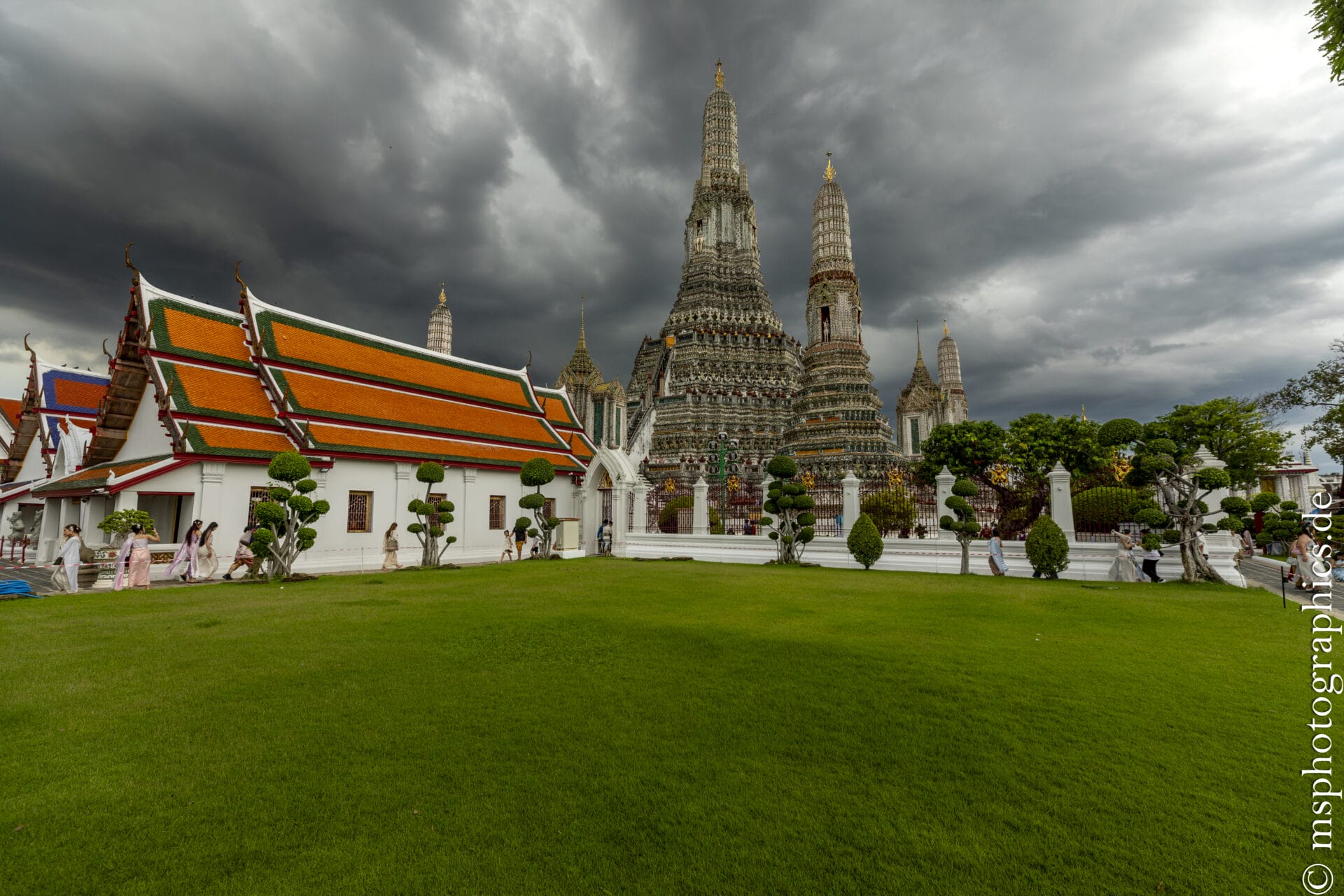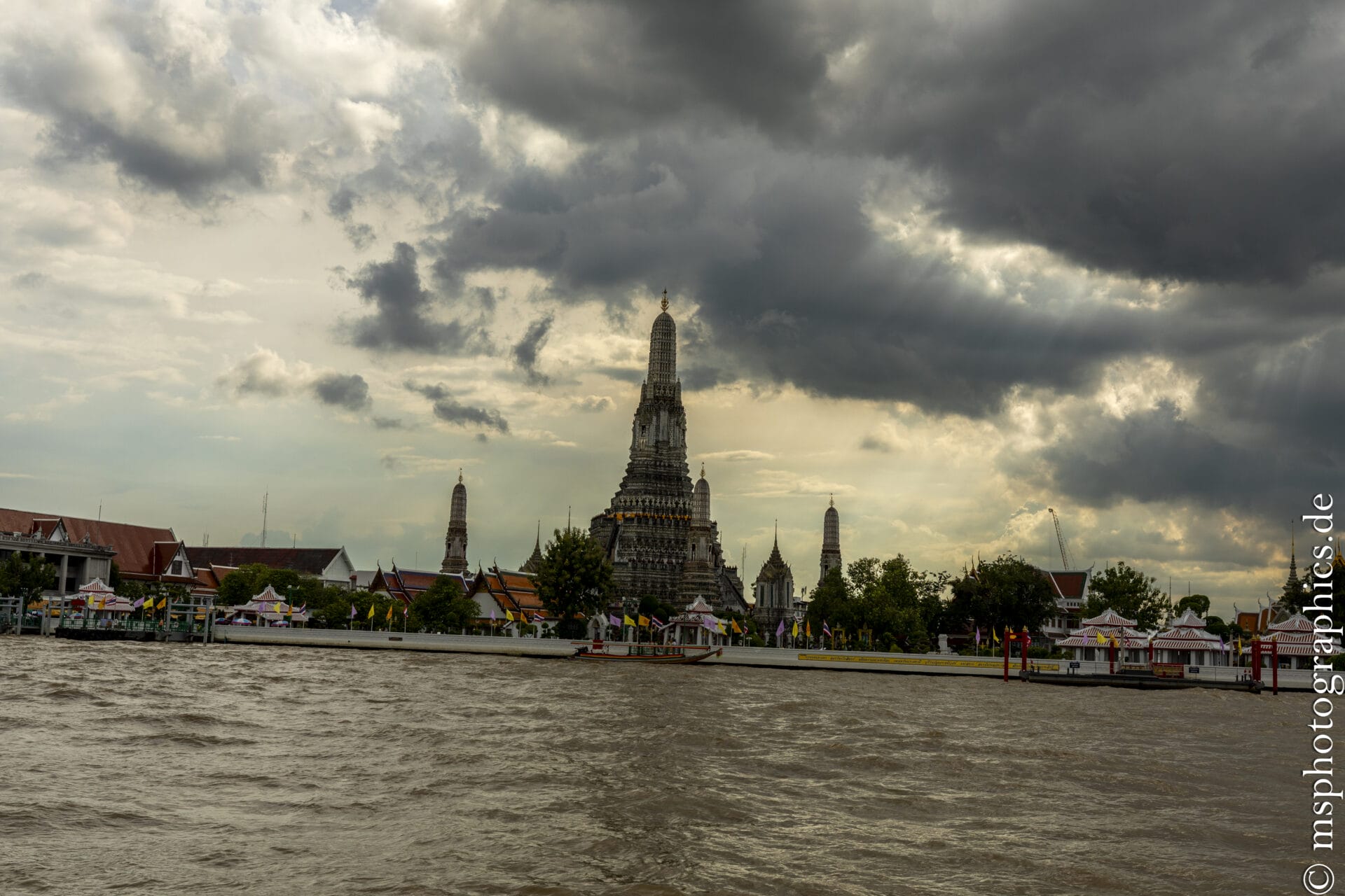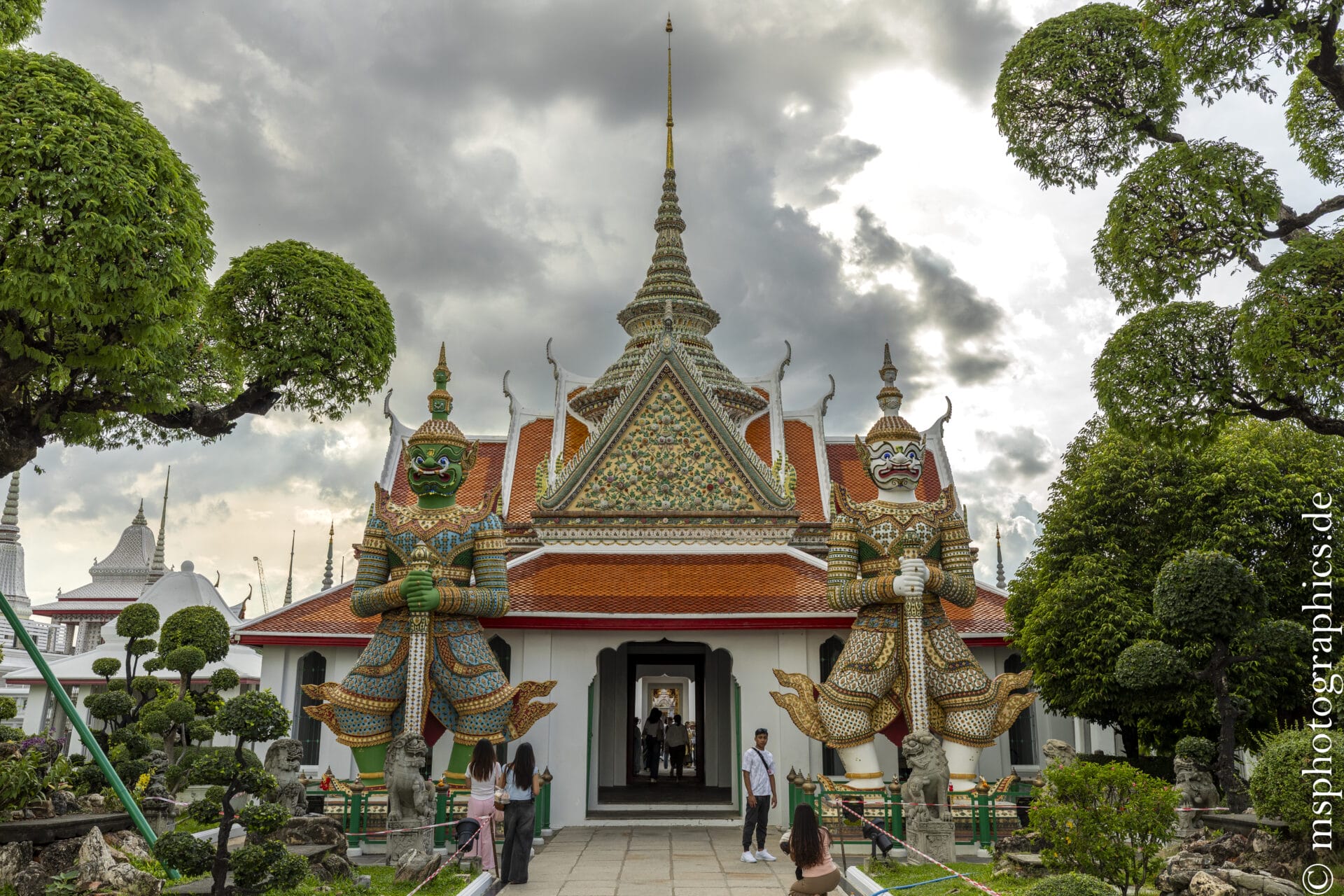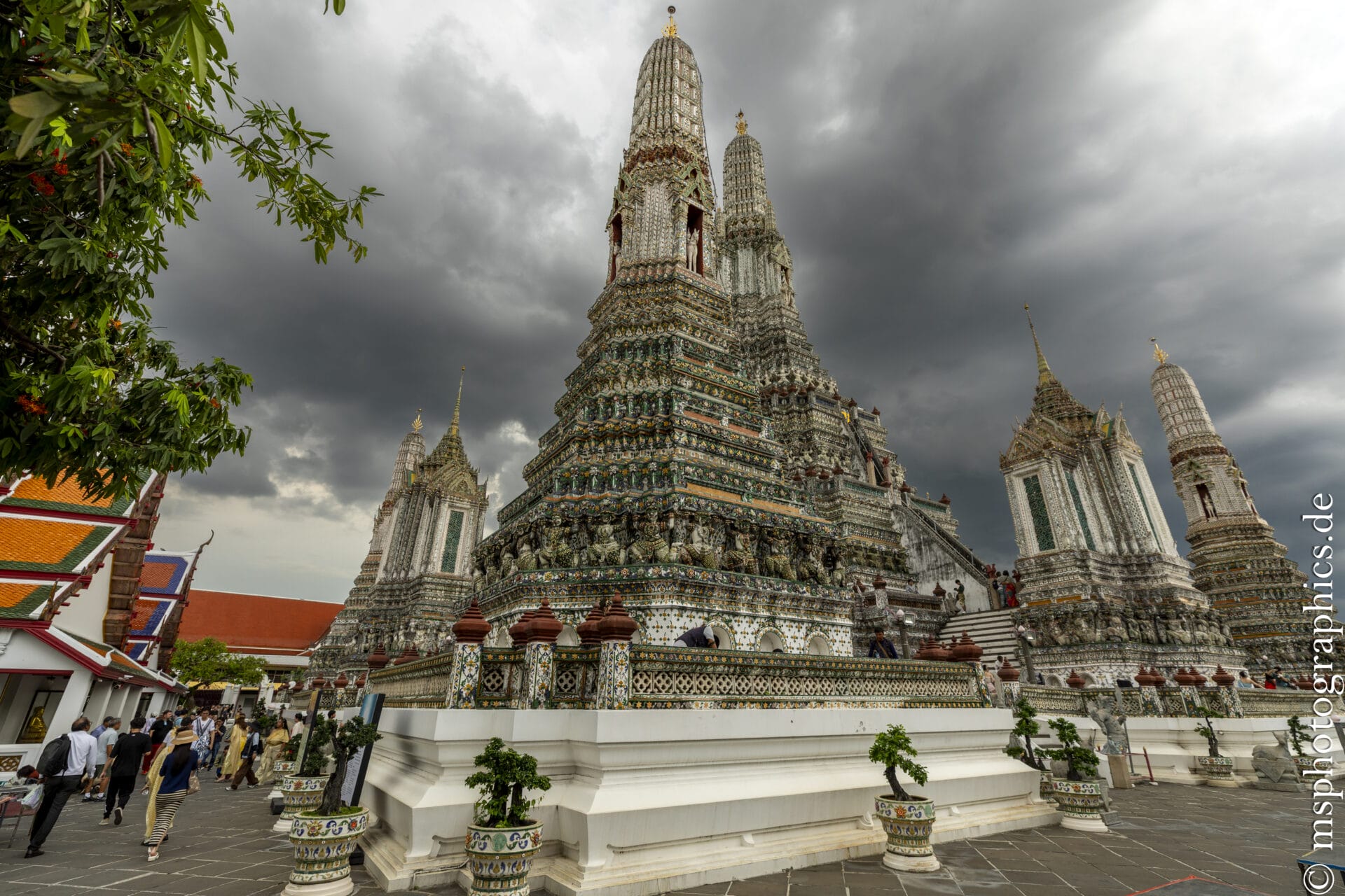 Der zentrale Prang ist rund 70 Meter hoch und kann teilweise bestiegen werden. Von dort bietet sich ein beeindruckender Blick über den Fluss und die historische Altstadt Bangkoks. Rund um den Hauptturm stehen vier kleinere Prangs sowie kunstvoll gestaltete Wächterfiguren, die die mythologische Rolle des Tempels unterstreichen.